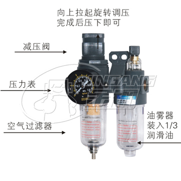 该气源处理三联件包括空气减压阀,过滤器、油雾器三大件。其中威压阀可对气源进行稳压,使气源处于恒定状态,可减小因气源气压突变时对阀门或执行器等到硬件的损伤。过滤器用于对气源的清洁。可过滤压缩空气中的水分,避免水分随气体进入装置。油雾器可对机体运动部件进行润滑。可以对不方便加润滑油的部件进行润滑,大大延长机体的使用寿命。o